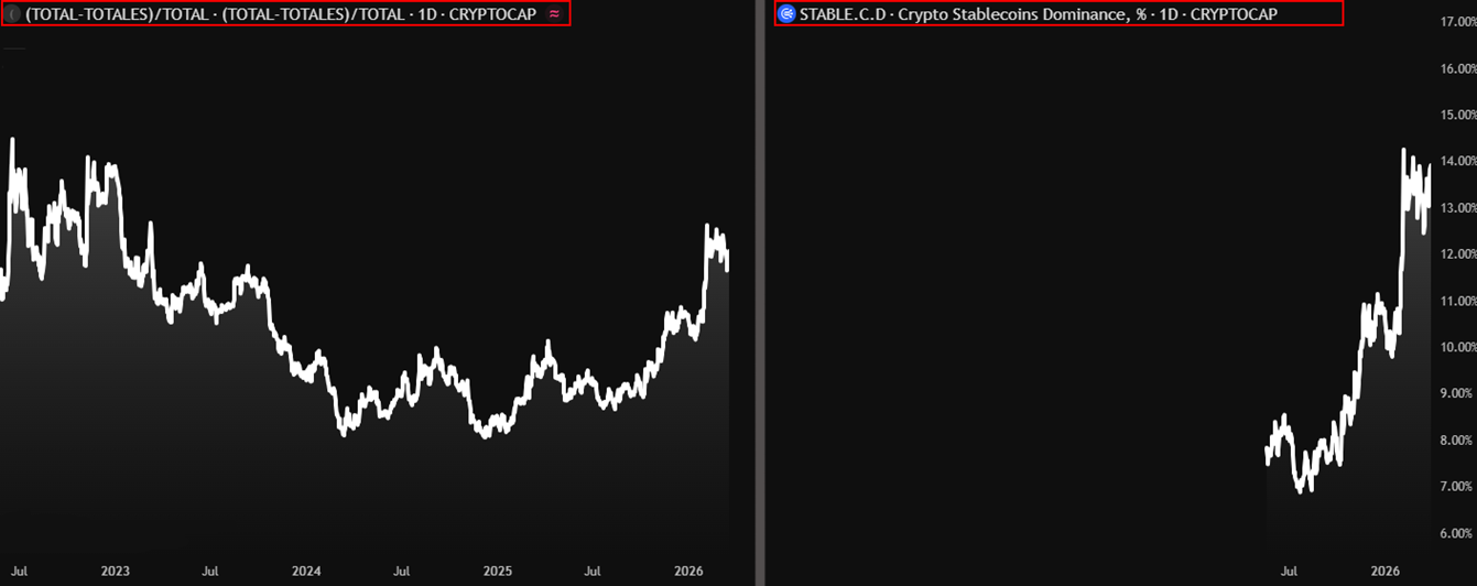 For stablecoin dominance, type `(CRYPTOCAP:TOTAL – CRYPTOCAP:TOTALES) / CRYPTOCAP:TOTAL`. TOTAL is total crypto market cap and TOTALES is total market cap excluding stablecoins. The math is simple: total minus non-stable, divided by total, gives you stablecoin dominance.