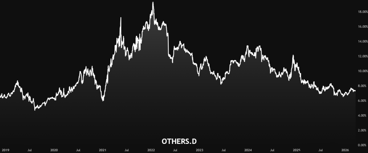 When OTHERS.D is rising, smaller coins are actually gaining ground relative to Bitcoin, Ethereum, and the rest of the top 10. During altseasons, OTHERS.D climbs as retail traders pour into smaller projects.