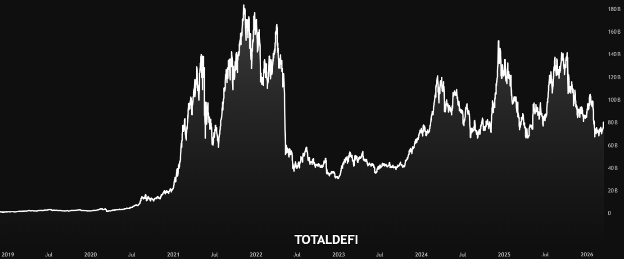 Comparing TOTALDEFI against TOTAL3 tells you whether DeFi is leading or lagging. If TOTALDEFI is outperforming TOTAL3, DeFi tokens are gaining relative strength.