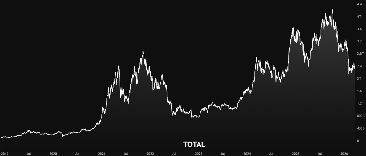 Traders watch TOTAL for macro-level support and resistance. If the total crypto market cap hits $2.5 trillion and gets rejected three times, that becomes a ceiling. Breaking through it means something fundamentally changed — new institutional inflows, a regulatory catalyst.